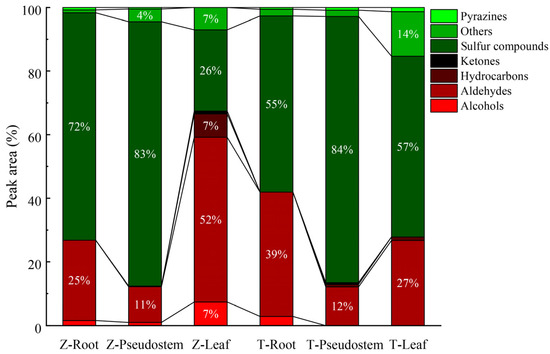 The compounds were classified according to their functional groups, and they principally comprised alcohols, aldehydes, ketones, hydrocarbons, pyrazines, and sulfur compounds (Table S2). The predominant volatile compounds in the roots and pseudostem of the Welsh onions were sulfur compounds (Figure 3). The sulfur compounds in the roots, pseudostem, and leaves of ‘Zhangqiu’ accounted for 72%, 83%, and 26% of the total content. In comparison, those of ‘Tenko’ accounted for 55%, 84%, and 57%, respectively. Aldehydes comprised no less than 11% of all the organs, and the highest content was in the ‘Zhangqiu’ leaves, accounting for 52% of the total peak area. In addition, the pyrazine, ketone, and alcohol contents were tiny in the three organs of the two cultivars. Hydrocarbons and ketones were not detected in the root, and pyrazines and alcohols comprised less than 3%.