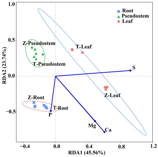 The element contents differed distinctly from the two cultivars’ three organs (Table 2). The content of each element in the roots and leaves was higher than that of the pseudostem. The sulfur content was the highest in the leaves, followed by the roots, and lowest in the pseudostem. The sulfur content of the pseudostem of ‘Zhangqiu’ was distinctly high, but the difference between the two cultivars’ root sulfur content was insignificant. Through the forward selection of the measured elements, we obtained a higher correlation between S, P, Ca, and Mg and various organs of the Welsh onion (Figure 4). The ordination diagram shows three distinct groups corresponding to different cultivars of volatiles. The first and second canonical axes show 45.56% and 23.74% of the data variance, respectively. The first axis separates the leaves from the pseudostem and roots, while the second axis separates the pseudostem from the roots. The RDA indicated that sulfur and calcium greatly affected the elements in the cultivars and organs.