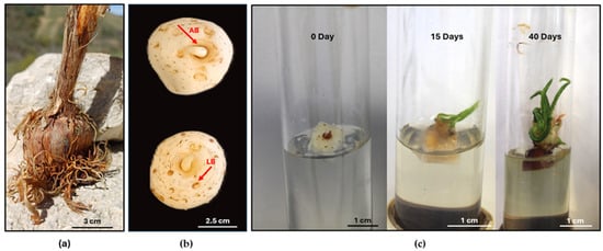 Corms of saffron from the Abruzzo region (a); corms with apical buds (AB) and lateral buds (LB) used for in vitro culture (b); development of initial explants in in vitro culture (c).