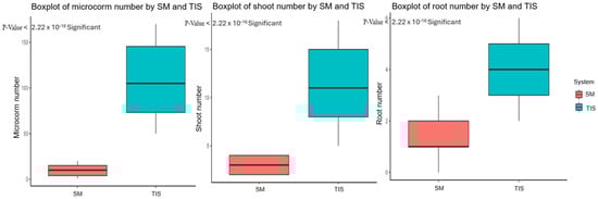 The t-test boxplot of growth parameters (microcorm, shoot, and root number) in TIS and semisolid medium (SM) cultures.