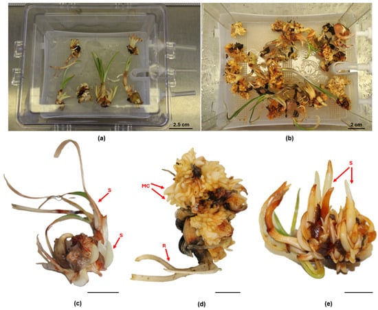 TIS culture of saffron at the beginning (a) and after 90 days (b) of culture in PlantformTM bioreactor. Explant after 30 days (c), 60 days (d), and 90 days (e); Bars = 1.5 cm. (S: Shoot; MC: Microcorm; R: Root).