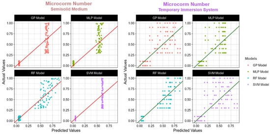 Table 4 also provides a detailed examination of RF, SVM, GP, and MLP in semisolid medium culture systems. Regarding microcorm predictions, both RF and SVM showed similar R2 values of 0.75, which can explain almost 75% of the variance in this growth parameter. However, GP and MLP with 0.77 and 0.78, respectively, had higher R2 values, indicating a better capacity to explain variance in microcorms. The MAE ranged from 0.11 to 0.12 for all models and was consistently low, showing a minor average divergence between the predicted and actual values. Similarly, the models were constant regarding the RMSE, which had values between 0.16 and 0.17, showing reliable accuracy in microcorm number prediction.