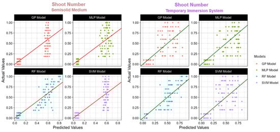 In the case of the semisolid medium, MLP exhibited competitive performance in predicting microcorm and shoot numbers, even though each model displayed a unique performance across many attributes, while SVM seemed to be more successful in predicting the root number. These results highlight the need to choose suitable machine learning algorithms for predictive modeling in semisolid medium by considering particular attributes and corresponding model performances.