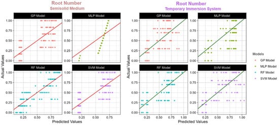 The actual and predicted value of TIS and semisolid medium root number using four models: RF: Random Forest; SVM: Support Vector Machines; GP: Gaussian Process; MLP: Multilayer Perceptron; R2: Coefficient of determination.