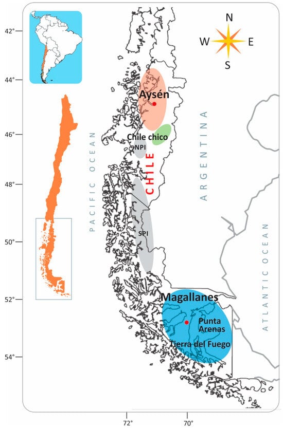 Calafate sample collection areas in Chilean Patagonia. Approximate Aysén (red) and Magallanes (blue) sampling regions are shown. Chile chico is part of the Aysén region; however, it exhibits a different climatic condition (green oval). NPI and SPI (grey) are the approximate areas covered by the Northern and Southern Patagonian Icefields.