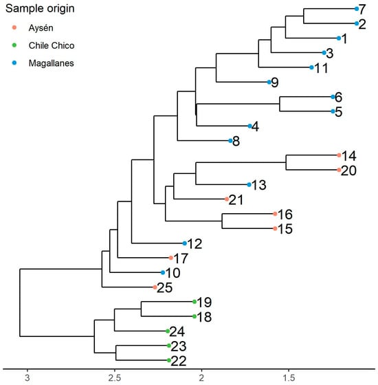 The genetic diversity of the populations was estimated using several indicators, such as the number of different alleles by population (A), number of effective alleles (Ae), observed heterozygosity (Ho), and expected heterozygosity (He), which were extracted from the allele frequencies calculated with the library polysat [] in the R environment. The fixation index (Fst) was also calculated for the Magallanes and Aysén populations to evaluate population differentiation based on the Hardy–Weinberg equilibrium. Regarding the markers’ performance, their polymorphic information content (PIC) and confusion probability (Cj) were also estimated. Unsupervised procedures, such as hierarchical clustering, following the unweighted pair group method with the arithmetic mean (UPGMA) using genetic distances (Euclidean) were performed to evaluate the population structure and visualize it using dendrograms []. Discriminant analysis of principal components was also performed using the library adegenet [], to discriminate the existence of discrete groups among the samples based on their molecular data.