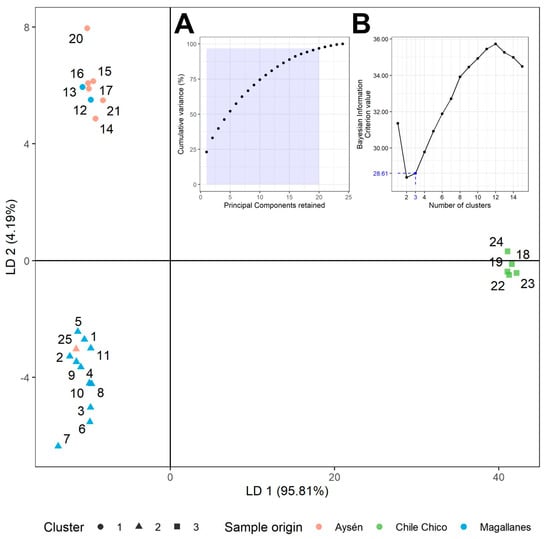 To estimate the existence of genetically differentiable discrete groups, two complementary unsupervised clustering methods based on the molecular data were performed. In this sense, hierarchical clustering (UPGMA) allowed us to obtain a dendrogram that revealed the existence of two differentiable genetic groups (Figure 2); the smaller one consisted of five accessions from Chile Chico. This is an isolated area of the Aysén region that is well known for its microclimate, which is warmer than other valleys at similar latitudes. Indeed, this is a fruit-producing zone [], where sweet cherry and apple orchards are not uncommon and vineyards have recently been established []. The other larger group included samples collected from other localities in Aysén, as well as from the Magallanes region, about 1000 km south, separated by the NPI and SPI (see map in Figure 1). Despite not having a clear separation between the subgroups, this cladogram suggests the existence of other less evident groups. To complement the previous approach, a discriminant analysis of principal components was performed. The resulting Bayesian information criterion suggests the existence of three clearly separated groups, considering the 25 calafate accessions (Figure 3). The smaller and most clearly separated group (n = 5 accessions, from Chile Chico), already identified in the dendrogram, was separated from the remaining accessions based on the first linear discriminant, which explains most of the observed variance (95.81%). The other two groups (11 and 8 accessions) were separated according to the second linear discriminant (4.19% of the variance explained). The larger group corresponded to the accessions from Magallanes (n = 12), and the other was integrated into the remaining accessions from Aysén (n = 8). The exceptions to this separation of regionally assigned accessions were one sample collected in Puerto Tranquilo, in the Aysén region, which clustered into the Magellanic group, and, on the contrary, two samples of Magallanes that were grouped with the larger Aysén clade. Currently, there is no explanation for this, but gene flow cannot be discarded at this point. Interestingly, as shown later in this manuscript, according to chemical analyses, a single sample from Aysén also co-clustered into the Magallanes group, but the opposite was not observed (samples from Magallanes associated with the Aysén clade).