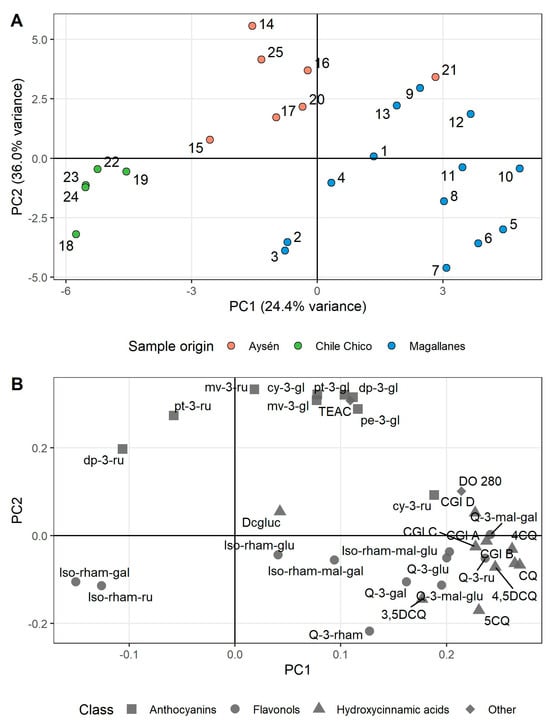 Principal component analysis of calafate fruit, where (A) scores: Aysén (red), Chile Chico (green), and Magallanes (blue); (B) loadings. Abbreviations of compounds are specified in Table 2. Families of compounds (anthocyanins, flavonols, and hydroxycinnamic acids) are indicated using different symbols.