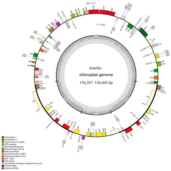 - Prabhudas, S.K.; Prayaga, S.; Madasamy, P.; Natarajan, P. Shallow Whole Genome Sequencing for the Assembly of Complete Chloroplast Genome Sequence of Arachis hypogaea L. Front. Plant Sci. 2016, 7, 1106. [Google Scholar] [CrossRef]