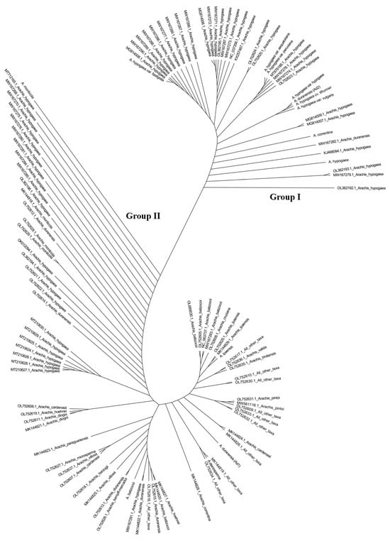 A total of 110 complete chloroplast genomes from 19 different Arachis varieties were utilized to construct a phylogenetic tree using the maximum likelihood method (Figure 2; Table S4). The phylogenetic tree comprised 14 genomes obtained in this study and an additional 96 genomes obtained from NCBI. The resulting phylogenetic tree showed two major groups, Group I and Group II, which encompassed a total of 39 and 71 Arachis chloroplast genomes, respectively. The cultivated peanuts with genome type AABB and the species with genome type AA (A. duranensis) are mainly distributed in Group I. Baisha1016 belongs to A. hypogaea var. vulgaris; Silihong belongs to A. hypogaea var. fastigiata; Yunnanqicai belongs to A. hypogaea var. peruviana; Chidao1 belongs to A. hypogaea var. aequatoriana; Xiaohongmao and Tifrunner belong to A. hypogaea var. hypogaea. They are belonging to A. hypogaea, which gathers with A. hypogaea in Group I. While species in Group II had different genome types, including AABB, BB, KK, EE, etc. For example, A. duranensis, A. monticola, and the cultivated peanut are close to each other in clades of Group II. A. hoehnei (BB) showed a close relationship with A. cardenasii (AA) and A. diogoi (AA), while A. ipaensis, another possible diploid ancestor of the cultivated peanut, is grouped closely with A. batizocoi (KK). Other varieties are summarized in a large clade, and it is impossible to draw a clear boundary between them (Figure 2, Table S6).