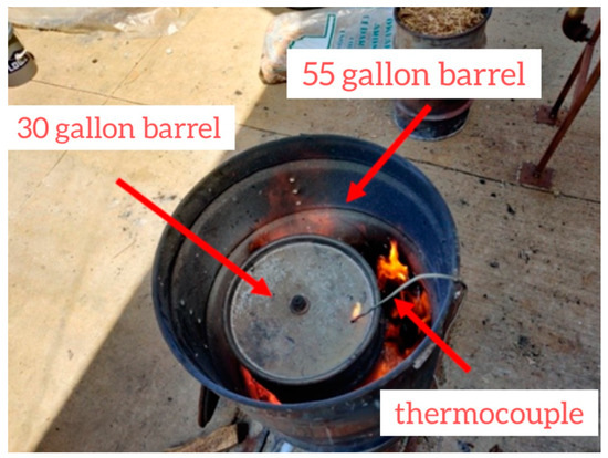 Biochar was prepared from ERC bark (Custom Wood Fibers & Cedar ERC bark, LLC., Stillwater, OK, USA) through the pyrolysis process [30]. To prepare the biochar, a double barrel system was used with a 30-gal (0.114 m3) barrel as the inner (carbonization) barrel with a lid and a 55-gal (0.208 m3) barrel as the outer (burning) barrel [31] (Figure 1). Thirty-two small holes (1.27 cm) were drilled around the large barrel (spaced 10 cm vertically and 50 cm horizontally) to facilitate the airflow, with one larger 7 cm diameter hole so an aluminum pipe could be inserted to provide air from a fan (motor horsepower 3 hp, high pressure blower, the radial base of 0.3 m in wheel diameter, 230/460 voltage) (Chicago Blower Corporation, Glendale Heights, Chicago, IL, USA). Two barrels were connected to the fan through a three-way pipe system. Likewise, eight equally spaced smaller holes (0.95 cm) were drilled in the base of the small barrel so that syngas produced inside the barrel could pass. Another hole (2.12 cm) was drilled in the middle of the lid for a thermocouple (SZZJ INC, Shenzhen, Guangdong). The thermocouple was connected to a PID controller (Ink bird, Shenzhen, Guangdong). Seasoned (weathered for 2–3 years) wood (35 cm × 15 cm) from Payne Country Tree Service (Stillwater, OK, USA) was placed in between the small and large barrels to create a fire. Biochar was produced by pyrolysis of the ERC biomass at three temperature ranges of 300–350 °C, 400–450 °C, and 500–550 °C for 3 h after the temperature hit the set point. With the temperature range of 200–250 °C, the complete conversion of the biomass to biochar was not observed and maintaining temperatures above 500–550 °C challenged the thermocouple functionality due to the risk of burnout and subsequent malfunctioning. So, we selected these three ranges of temperature for pyrolysis. After the production of the biochar, it was stored in the shade and used after approximately after a month of storage.