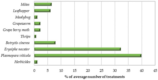 The field surveys conducted among winegrowers in the Sebou Basin provided an overview of the phytosanitary status of vines in the study area. Oomycete and fungal diseases such as downy mildew (P. viticola), powdery mildew (E. necator), and grey mold (B. cinerea) were identified as the main diseases affecting the vines. The most significant pests were mites (Tetranychus urticae), leafhoppers (Empoasca vitis), and the grape berry moth (Lobesia botrana). Based on the responses from surveyed winegrowers, the predominant diseases, namely downy mildew and powdery mildew, require the highest number of treatments, accounting for 39% and 32% of the total treatments, respectively. In terms of vineyard-invading pests in the surveyed region, mites, and leafhoppers emerged as the most important, representing 6.49% and 6.07% of the average treatments (Figure 2).