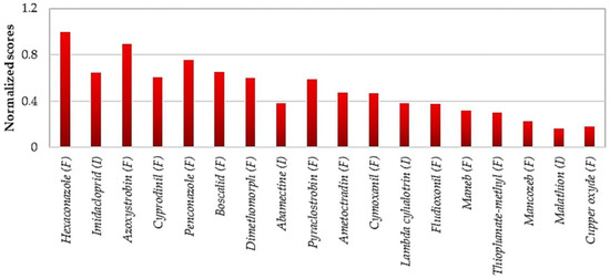 To compare the risk scores of the selected pesticides, the environmental scores were normalized (Figure 6) by dividing each value by the maximum value of each risk indicator. In our study, all EIQ results were divided by 7.6475 as the maximum score for the EIQ application in this study, corresponding with hexaconazole.