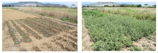 Plants of S. hispanicus after crop establishment (left photo) and at full growth (right photo; photos are from the personal record of Spyridon A. Petropoulos).