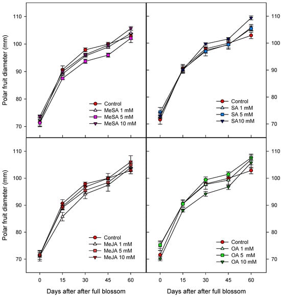 Polar diameter (mm) during growth and ripening of pitahayas from control and treated plants with methyl salicylate (MeSa), salicylic acid (SA), methyl jasmonate (MeJa), and oxalic acid (OA) at concentrations of 1, 5, and 10 mM. Data are the mean ± SE (n = 9).