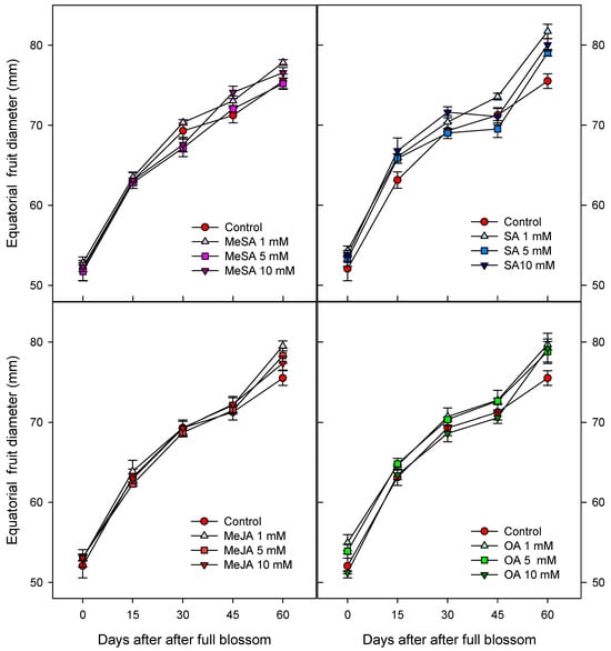 Equatorial diameter (mm) during growth and ripening of pitahayas from control and treated plants with methyl salicylate (MeSa), salicylic acid (SA), methyl jasmonate (MeJa), and oxalic acid (OA) at concentrations of 1, 5, and 10 mM. Data are the mean ± SE (n = 9).