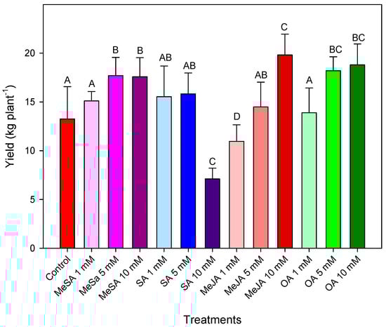 Crop yield (kg plant−1) at harvest time of pitahayas from control and treated plants with methyl salicylate (MeSa), salicylic acid (SA), methyl jasmonate (MeJa), and oxalic acid (OA) at concentrations of 1, 5, and 10 mM. Data are the mean ± SE (n = 9). Bars with different letters denote significant differences at p < 0.05 after the Tukey’s test.