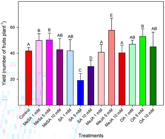 Crop yield (number of fruits plant−1) at harvest time of pitahayas from control and treated with methyl salicylate (MeSa), salicylic acid (SA), methyl jasmonate (MeJa), and oxalic acid (OA) at concentrations of 1, 5, and 10 mM. Data are the mean ± SE (n = 9). Bars with different letters denote significant differences at p < 0.05 after the Tukey’s test.