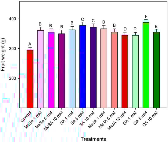 Fruit weight (g) at harvest time of pitahayas from control and treated with methyl salicylate (MeSa), salicylic acid (SA), methyl jasmonate (MeJa), and oxalic acid (OA) at concentrations of 1, 5, and 10 mM. Data are the mean ± SE (n = 9). Bars with different letters denote significant differences at p < 0.05 after the Tukey’s test.
