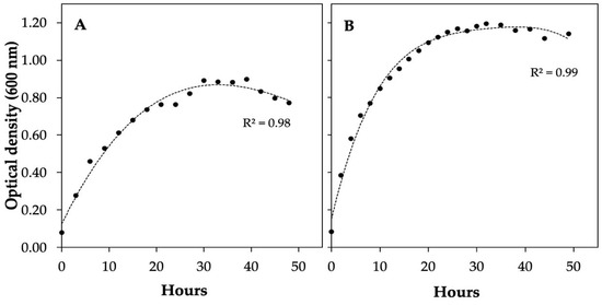 Growth kinetics of pure strains of Lysinibacillus phytate mineralizers (n = 5): (A) strain Sp-5; (B) strain Sp-6.
