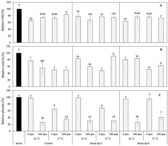 The changes in relative concentrations (%) of (A) organic matter, (B) total nitrogen, and (C) phytate relative to the initial concentration and after inoculation without/with Lysinibacillus strains collected in aquaponic systems for 12 days. The data represent the average ± SD. (n = 4). Different letters represent significant differences between treatment and time of p ≤ 0.05.