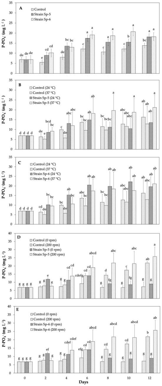 Effect of the inoculation of pure strains of phytate-mineralizing Lysinibacillus on the availability of inorganic P in the solution of the solids generated in aquaponic systems. (A) Effect of strains of Lysinibacillus phytate mineralizers on the mineralization of solids in the system. (B) Effect of Lysinibacillus (Sp-5) phytate mineralizers under different temperature conditions (24 and 37 °C). (C) Effect of Lysinibacillus (Sp-6) phytate mineralizers under different temperature conditions (24 and 37 °C). (D) Effect of Lysinibacillus (Sp-5) phytate mineralizers in different oxygen conditions (anaerobic and aerobic conditions). (E) Effect of Lysinibacillus (Sp-6) phytate mineralizers in different oxygen conditions (anaerobic and aerobic conditions). The data represent the mean ± SD. (n = 3). Different letters represent significant differences between treatments and time (days) at p ≤ 0.05.