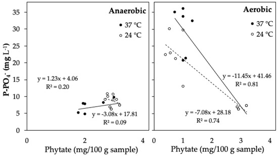 This increase in PO4− coincided with the decrease in the relative phytate content at day 12 relative to the initial phytate content at day 0, wherein a lower relative content was observed in the treatments with aerobic conditions, presenting significant differences at p < 0.05 (Figure 3C). Likewise, the correlation analysis confirmed the importance of aerobic conditions for the processes of phytate mineralization and degradation, as, compared to anaerobic conditions, a high correlation was observed with an R2 of 0.74 (24 °C) and 0.81 (37 °C); additionally, negative correlation coefficients of −0.86 and −0.90 were observed, indicating that under aerobic conditions, the concentration of phytate decreases and the concentration of phosphate increases (Figure 5).