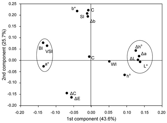 Variables with high eta2 were discriminated by principal component analysis (PCA) analysis into two separate groups (Figure 1); group one with VSI, BI and color attribute a* and group two with L*, ΔL and Δa values including a variable Δh° with medium eta2 values for factors treatment (SWE) and storage time (Table 3). The remaining variables were either grouped differently or remained scattered (Figure 1).