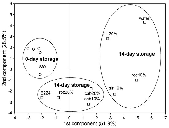 Further, the PCA of SWEs in day 0 and day 14 of storage revealed two distinct groups within day 14 (Figure 2): the E224-control group which included treatments cab10%, cab20%, roc20% and E224-control, and the water-control group which included sin10%, sin20%, roc10% and water-control). Sin10% was somehow in the border of the two groups, and depending on the variable examined, it occasionally might participate in either the E224-control or the water-control group.