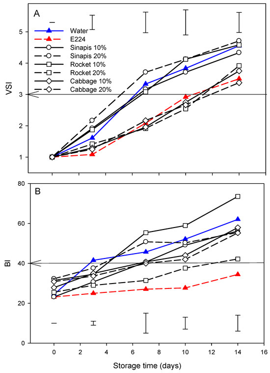 A similar pattern of browning development in cut mid rib segments of leaf lettuce for SWE during storage for 14 days at 7 °C was also shown for variables BI (Figure 3B). The correlation of VSI with BI (R2 = 0.833, p < 0.05) indicated that the acceptable sales limit (VSI score point 3) corresponded to a value of 40. The BI was more sensitive than VSI; for BI (Figure 3B), the SWE treatments that formed a group with the water-control, roc10% and sin 20% increased above the acceptable sales limit as early as day 3, sin10%, cab10% and cab20% at day 14, and roc20% as late as day 14, while the E224 preservative solution-control did not reach a critical level even by day 14th. E224 (sodium hydrogen sulfite) is considered as an anti-browning effective agent since it reacts with o-quinones yielding non-browning sulfo-adducts [54]. Although sulfites have been used in the food industry to inhibit PPO-induced browning of cut produce for a wide range of products [10], its use is associated with side effects or toxicity [11].
