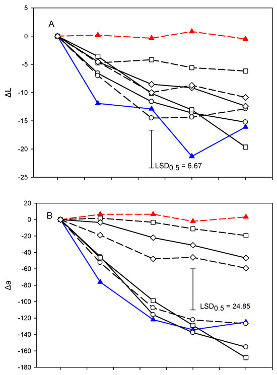 The L* (0 = black, 100 = white), a* (+red, −green) and b* (+yellow, −blue) color coordinates were determined according to the CIELAB coordinate color space system [45]. For color change during storage, ΔE (total change in color) and the % inhibition of ΔL (percentage change in brightness), Δa (percentage change in green color to red), and Δb (percentage change in blue color to yellow), were calculated to provide normalized indicators for eliminating the heterogeneity among the samples [46]. The method of calculation is shown below: