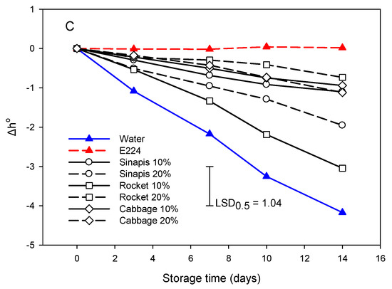 The Δa values (Figure 4B) of fresh-cut lettuce were increased during storage following a pattern similar to VSI in two distinct groups (the E224 group: cab10%, cab20%, roc20% and E224-control, and the water-control group: sin10%, sin20%, roc10% and water-control) to show statistically significant differences at the end of storage (p < 0.05). Rocculi [59] used only L* and a to evaluate browning in potato pieces by choosing the parameters they used. Lante [60] used only the total color change, ΔE, of the L*a*b color model to evaluate the effectiveness of UV radiation in the preservation of cut apple and pear varieties.