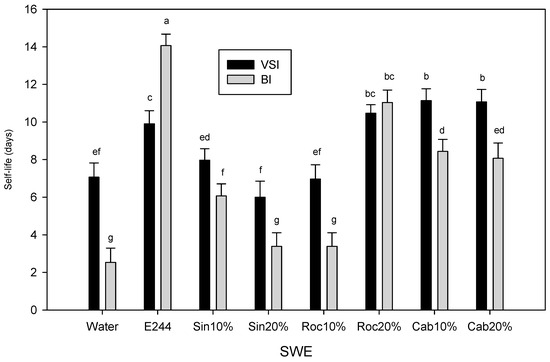 Shelf-life was calculated as the time that VSI or BI (following the correlation of VSI with BI) for browning crossed the threshold of 3 and 40, respectively (Figure 3A,B). Shelf-life based on Δa, Δh° and ΔL were similar to BI. The SWE that showed the highest performance were the E224-control group which included cab10%, cab20% and roc20% with 11.5, 11.3 and 10.4 days of effective acceptable browning levels based on VSI and 9, 8.5 and 11.5 days based on BI, respectively. It should be noted that the shelf-life for the preservative-control was about 10 and 14 days based on VSI and VI, respectively (Figure 5).