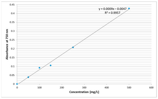 Total polyphenols content (TPC) was evaluated using the Folin–Ciocalteu method [17,46]. The results are expressed as mg gallic acid equivalents (GAE)/mL using an equation obtained from a calibration curve presented in Figure 1. The absorption was determined spectrophotometrically, by using a UV/VIS Spectrophotometer (Shimadzu UV-1280, Kyoto, Japan), at 750 nm.