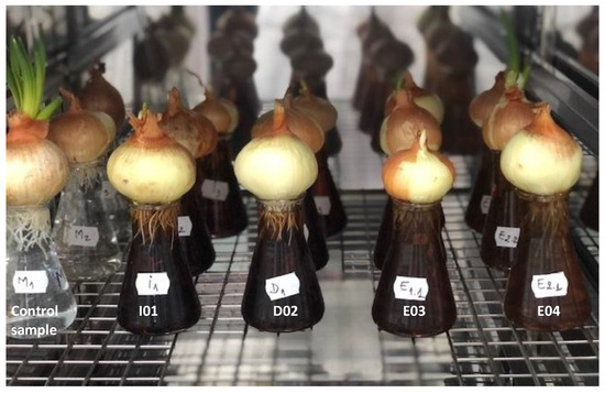 For the Allium cepa test, onion bulbs were purchased from a local market, chosen at about the same size, and the outer scales of the bulbs were carefully removed [32,33,34]. A total of 15 onion bulbs were placed in tap water for 72 h. The next day, a series of 3 bulbs were maintained in the four oregano extracts as such, without any dilution, in a SANYO growth chamber (model MLR-351, Osaka, Japan) in controlled conditions for 24 h in the dark, at 22 °C (Figure 2). As a control, a series of 3 bulbs was placed in water.