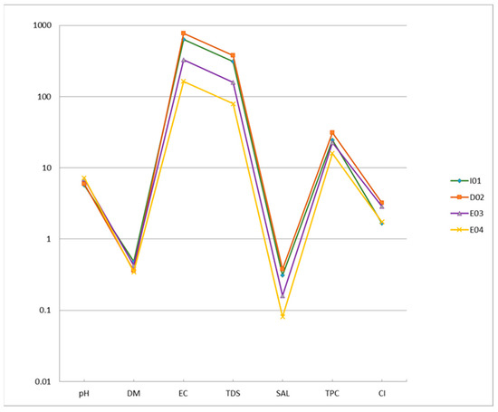 The results regarding the evaluation of the four types of extracts from the point of view of some representative physicochemical parameters such as dry matter (DM), pH, electrical conductivity (EC), total dissolved solids (TDS), and salinity (SAL), the content of phenolic compounds (TPC), and the color intensity (CI) are summarized in Table 1 and graphically represented on the Schoeller–Berkaloff diagram (Figure 3).