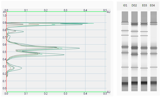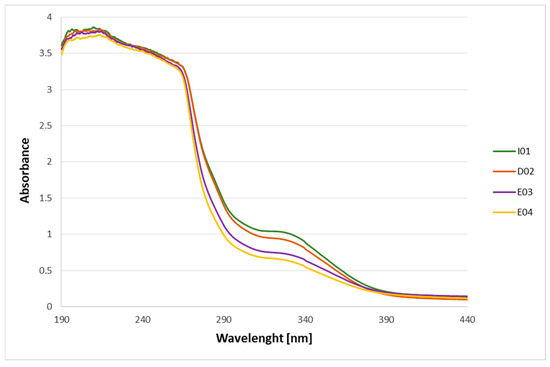 After UV-Vis scanning of the samples, a comparative spectrophotometric fingerprint of oregano extracts was recorded in the representative 190–440 nm range (Figure 4). It can be noted that the samples present a similar profile with a relatively significant difference in the 260–360 nm range. Phenolic acids such as caffeic and gallic acid are highly absorbing and highly overlapping in this range [55,56], showing that these compounds are present in the oregano extract samples.
