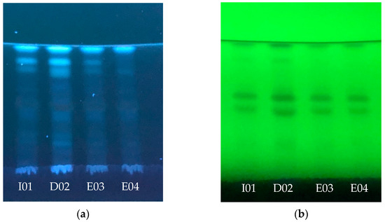 HPTLC silica gel plates developed with ethyl acetate–water–formic acid (85:15:10, v/v/v) at 366 and 254 nm are presented in Figure 5.