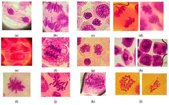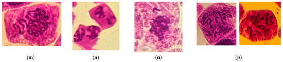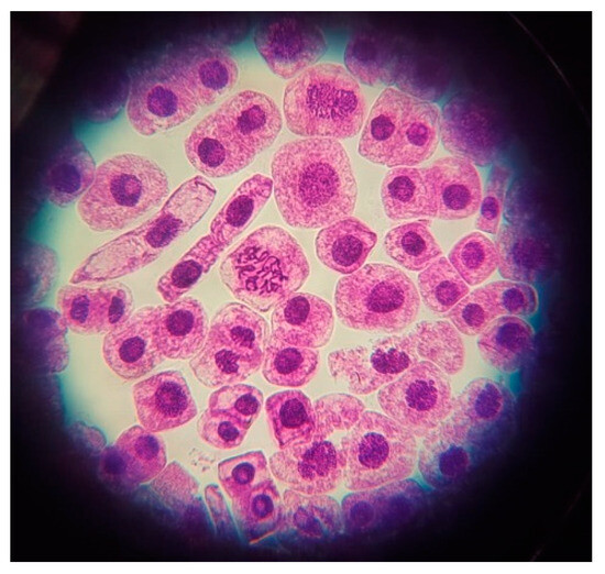 The mitotic index represents the ratio between the cells in mitosis and the total number of analyzed cells and was calculated according to Equation (1), where I is the interphase, P is the prophase, M is the metaphase, A is the anaphase, and T is the telophase: