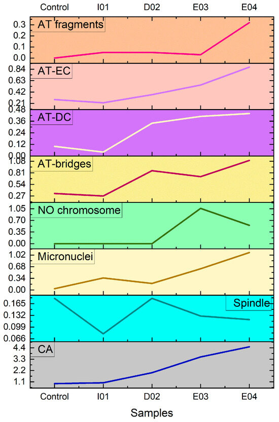 A-T with delayed chromosomes were also detected, with the most representative sample being hydroalcoholic extract sample E04 (0.44%), closely followed by sample E03 (0.41%) and aqueous extract D02 (0.34%). In the case of infusion sample I01, the amount of A-T with delayed chromosomes (0.04%) was lower than that of the control sample (0.10%).