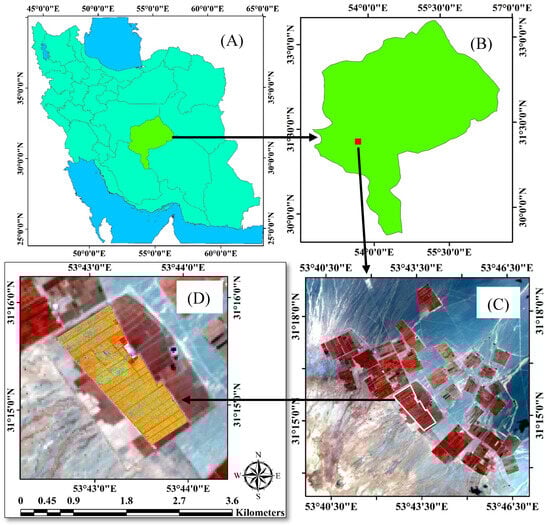 Location of the study area in Iran (A), Yazd province (B), pistachio orchards (C) and pistachio orchard investigated (D).