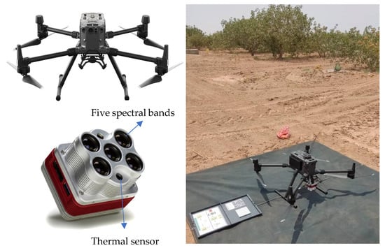 In the investigated farm, a plot of 207 ha (Figure 1D) was surveyed using a UAV on 10 July 2022. Images of the pistachio farm were captured using the DJI Matrice 300 RTK drone, equipped with the MicaSense Altum multispectral sensor (Figure 2). The MicaSense Altum sensor features five spectral bands spanning the blue, green, red, red edge, and near-infrared wavelengths, in addition to a thermal band (Table 1). Installed on the stabilizer system of the Matrix 300 UAV, the sensor facilitated automated image capture with predefined flight paths and areas stored in the UAV controller. The flight parameters included a longitudinal and transverse image overlap of 80% and 40%, respectively, at a flight altitude of 60 m. Although the longitudinal overlap does not affect the UAV’s battery consumption, the increase in the transverse overlap enhances the flight lines and as a result increases the battery consumption. Longitudinal overlap was considered greater than transverse overlap. Additionally, to reach a pixel size of 40 cm for the thermal band, a height of 60 m was chosen for the flight. Flying at an altitude of 120 m resulted in a pixel size of 80 cm for the thermal band, which was not accurate enough for small trees. Due to the extent of the surveyed plot and UAV battery limitations, the entire study area was photographed in six separate flights, each lasting approximately 25 min.