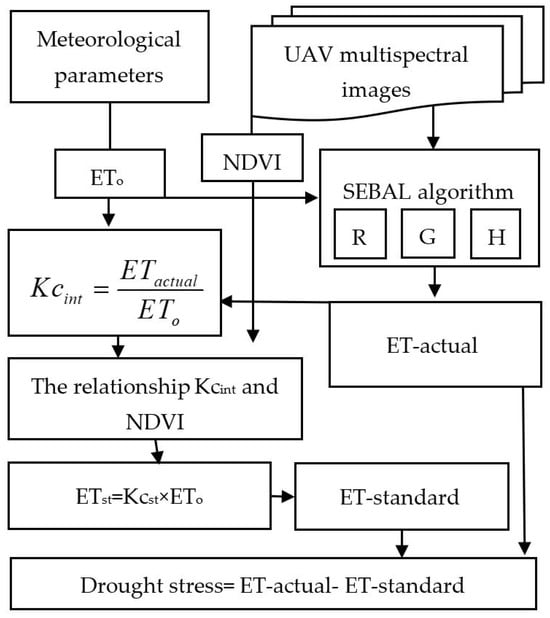 Generally, this study can be described in four steps. In the first step, the actual evapotranspiration (ETa) is calculated using the SEBAL algorithm (Section 2.3.1). The second step is to calculate the reference evapotranspiration of the plant and determine the relationship between NDVI and the instant crop coefficient (KCint) obtained through the SEBAL algorithm (Section 2.3.2 and Section 2.3.3). The third step consists of obtaining the standard evapotranspiration through the relationship between the crop coefficient and NDVI (Section 2.3.3). And the fourth step is to obtain the drought stress map of the field by determining the difference between actual evapotranspiration with the standard (Figure 3). In general, these steps were developed in MATLAB R2023a software and maps were prepared using ArcGIS 10.8 software.