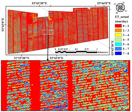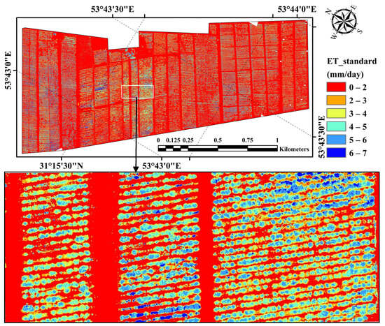 Considering the phenology stage of pistachio trees (middle stage of growth), the weather and FAO 56 guidelines, the value of the crop coefficient (Kc) on the date of imaging was 1.17 for the whole farm. In general, according to the FAO 56 guidelines, the standard ET for this farm should be 7.8 mm/day. According to Figure 4, ET ranged between 7 and 8 mm/day in some pistachio rows, but it was less than 7 mm/day in some trees. Therefore, ET is different in each tree depending on, e.g., canopy cover and the leaf area index. As a result, it is necessary to first prepare a standard ET map and then compare the ET of each tree with the optimal ET value of the same tree.