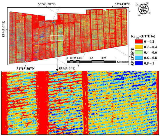 According to Equation (9), in the SEBAL algorithm the reference evaporation fraction (ETrF) can be defined as the instantaneous crop coefficient (Kc-int), because when ETrF is multiplied by the evapotranspiration of the reference plant (ETo), the actual amount of evapotranspiration (ETins or ETa-ins) will be obtained. When the actual evapotranspiration is calculated through the SEBAL algorithm (ETa) and the standard evapotranspiration based on the FAO 56 guidelines (ETc), the trees under drought stress can be identified by examining the difference between both values. As mentioned, the crop coefficient (Kc) is needed to calculate standard evaporation (ETc). The crop coefficient varies according to plant type, climate and plant development stages [].