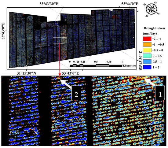 The drought stress map of the study area on 10 July 2022, is shown in Figure 8. This map is the difference between the actual evapotranspiration map (Figure 4) and the standard evapotranspiration (Figure 7). In Figure 4 and Figure 7 the farm soil is placed in the class 0–2 mm of evaporation and transpiration (image background), and thus in Figure 8, the areas without pistachio trees or the field soil (NDVI < 0.2) are displayed as background to clearly show the trees and improve the accuracy of drought stress map. According to Figure 8, although in general the ET of the farm is close to normal conditions and the actual evapotranspiration (ETa) is higher than the standard evapotranspiration (ETst), drought stress conditions are observed in some rows and trees (negative values with yellow, orange and red colors). In the present study, some of the stress points in the map were further investigated through field visits. For example, in point 1, a row of trees with stress is shown (Figure 8). According to the field visits, signs of stress (e.g., small and sunburned leaves) were observed in this row, which was caused by the failure of the irrigation system and the high intensity of the pistachio psyllium pest (Figure 9A,D). At point 2, a semi-dried and stressed tree was observed, which according to the field visits was caused by the strain of the irrigation system (Figure 9B,C).