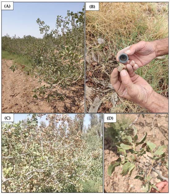 Observation of drought stress for validation of sites identified in Figure 8. (A) signs of small and sunburned leaves and no new annual growth; (B) straining of the pressurized irrigation system; (C) semi-drying of the pistachio tree; and (D) the effect of psyllid pest (Agonoscena pistaci) on pistachio leaves.
