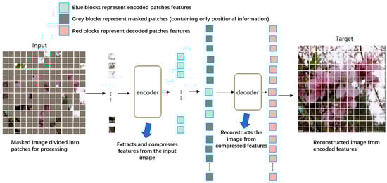Figure 3 depicts the specialized architecture of the MAE, highlighting its unique asymmetric encoder–decoder structure tailored for our application in flower image reconstruction. Unlike traditional autoencoders that often employ symmetrical dimensions for encoding and decoding, MAEs leverage an asymmetric architecture, where the encoder is designed to process a greater volume of data than the decoder. In this figure, the input image is divided into patches and partially masked, illustrating the model’s capacity to handle incomplete data []. The encoder, a larger and more complex network component, compresses the visible patches into a compact latent representation, capturing the critical information while disregarding the masked sections. These encoded data are then processed by a relatively smaller decoder, tasked with reconstructing the full image, including the previously masked portions. The result is a reconstructed target image that is then evaluated against the original for fidelity, demonstrating the MAE’s effectiveness in feature preservation and image recovery []. This asymmetric design is crucial for the MAE’s efficiency and accuracy in tasks that require robust feature extraction from incomplete datasets, as exemplified by our flower recognition model.