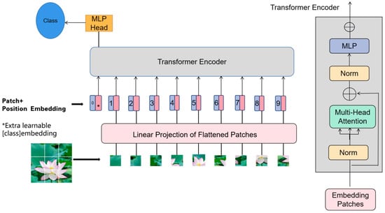 Due to its simplicity, effectiveness, and robust scalability, the ViT model is considered a milestone in the field of computer vision. It has garnered widespread attention and inspired numerous subsequent studies. For instance, Beal et al. combined the ViT and Faster RCNN models as the backbone network for feature extraction, achieving impressive results in classification and localization tasks for targeted regions []. Among these achievements, Alexey Dosovitskiy et al. [] experimentally verified that the ViT-Large-I21k model achieved a classification accuracy of 99.60% on the Oxford-102 Flowers dataset, underscoring the model’s potential for high-accuracy image classification tasks.
