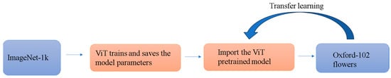 In the depicted process (Figure 5), parameter weights from the ViT-Large model, initially pre-trained on the extensive ImageNet-1K dataset, are extracted and strategically transferred to the Oxford-102 Flowers dataset. This transfer involves adapting the model parameters through an MAE-based pre-training approach, tailored specifically to enhance its relevance and performance in the floral domain. This adaptation not only preserves the robust features learned from a diverse set of generic images but also fine-tunes the model to recognize and classify various flower species with enhanced accuracy. Figure 5 illustrates this transfer and adaptation process, highlighting the flow from initial training on ImageNet-1K to its application on the specialized floral dataset, thereby significantly enhancing the model’s discriminatory power in flower recognition tasks.